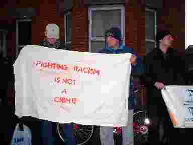 On 27th March 2001Anti-Racism groups held a protest tomorrow at Bertie Ahern's constituency office, St. Lukes in Drumcondra, to demand the dropping of charges against activists who were arrested at a protest last year. The eleven activists involved in the peaceful sit-in on March 28th 2000 have been charged under the Public Order Act and face large fines and possibily jail sentences.
