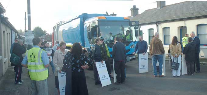 The anti-bin tax campaign in Stoneybatter took its first action today when it blockaded a bin truck just off the Oxmantown road. The truck was blockaded for one hour as a solidarity gesture with the campaign in Fingal. Today activists from that campaign may be jailed.