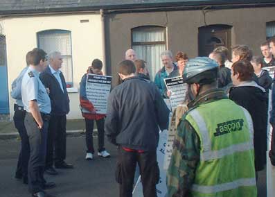 The action was decided at a meeting Wednesday night (see report below). Over 20 people took part in the blockade, the vast majority of them local residents. A couple of others like myself are activists in neighbouring campaigns, Stoneybatter residents had helped us out last week so we were happy to help them out.